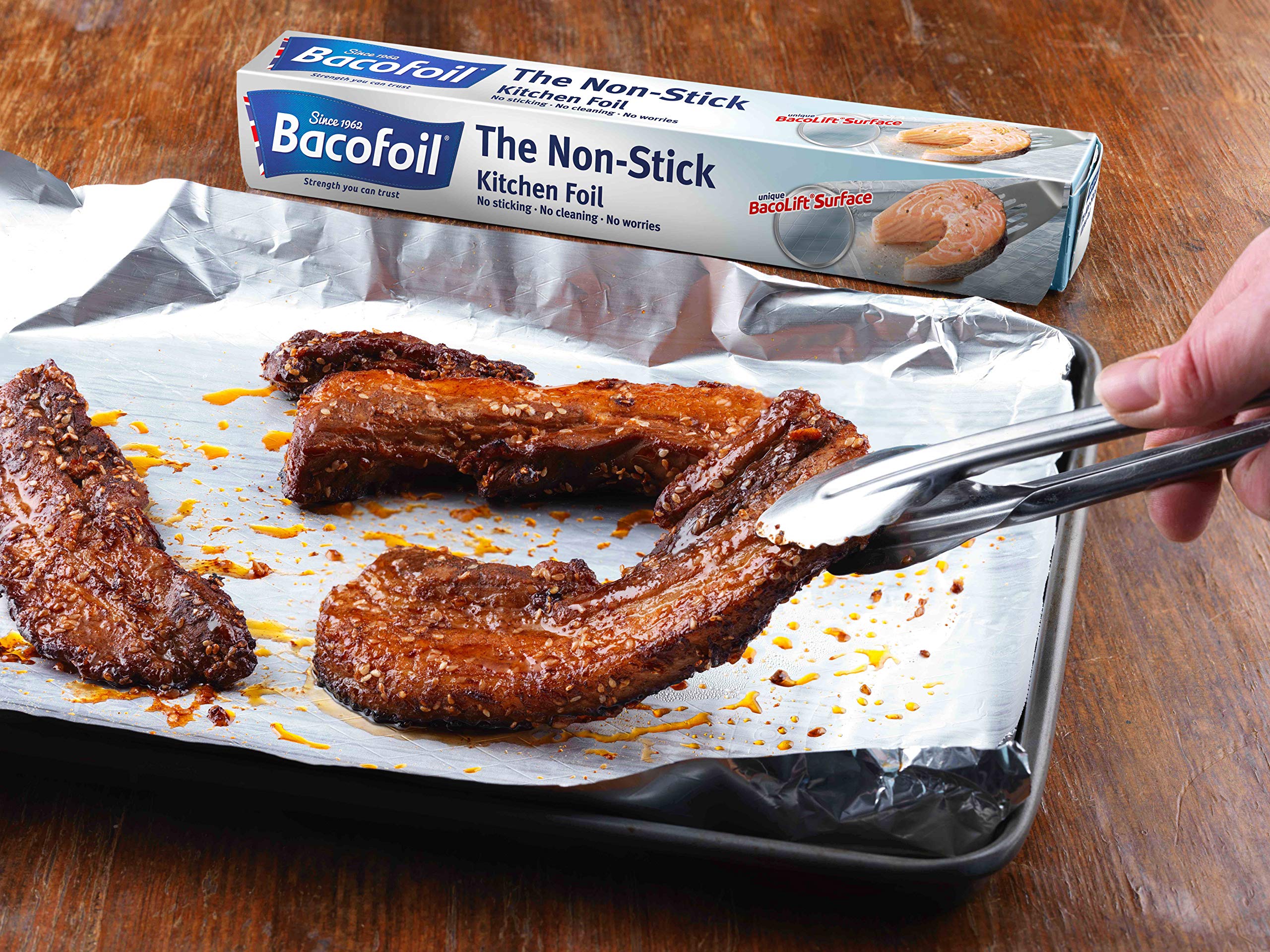 • Aluminium foil with unique BacoLift non-stick surface, Reduced risk of food sticking while preserving the flavour and look of food, Time saving when cleaning and washing up, No need to use oil or butter making it the healthier way to prepare food, Always use the non-stick (non-shiny) side