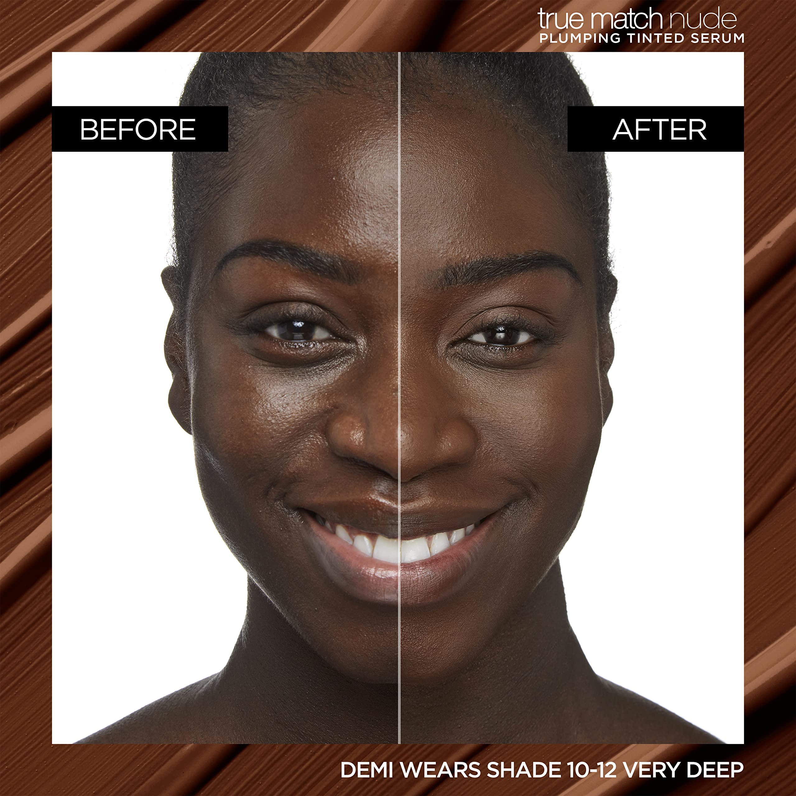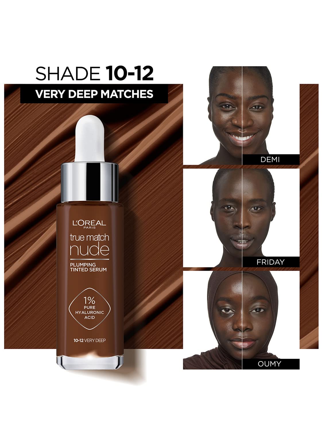 L’Oreal Paris True Match Nude Plumping Tinted Serum, 1% Hyaluronic Acid, Instantly Evens, Brightens, and Hydrates Skin, Shade 10-12, Very Deep