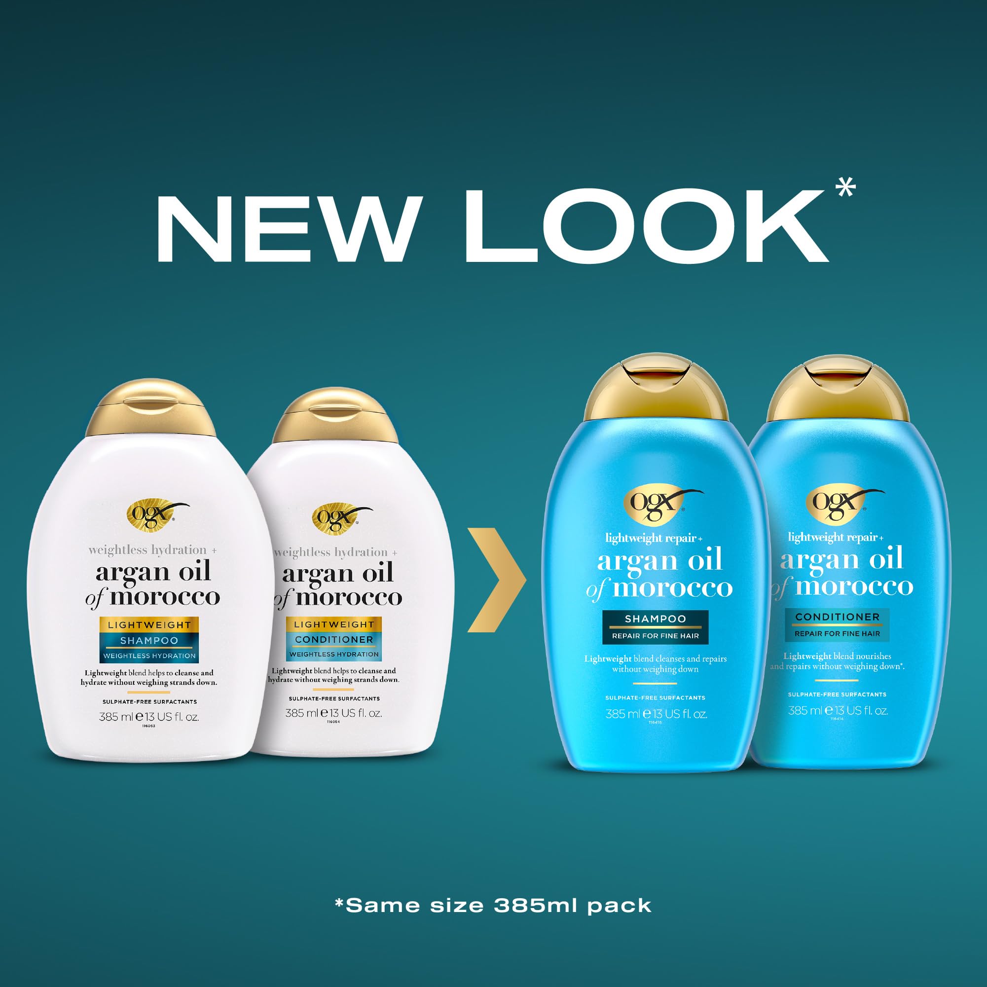Designed for fine hair, NEW OGX Weightless Hydration Argan Oil Lightweight shampoo is infused with moroccan argan oil helps to cleanse and hydrate your hair…without weighing it down. This salon quality, sulfate free* blend will help leave your hair feeling healthier, nourished, smooth and up to 5 x stronger in just two washes**