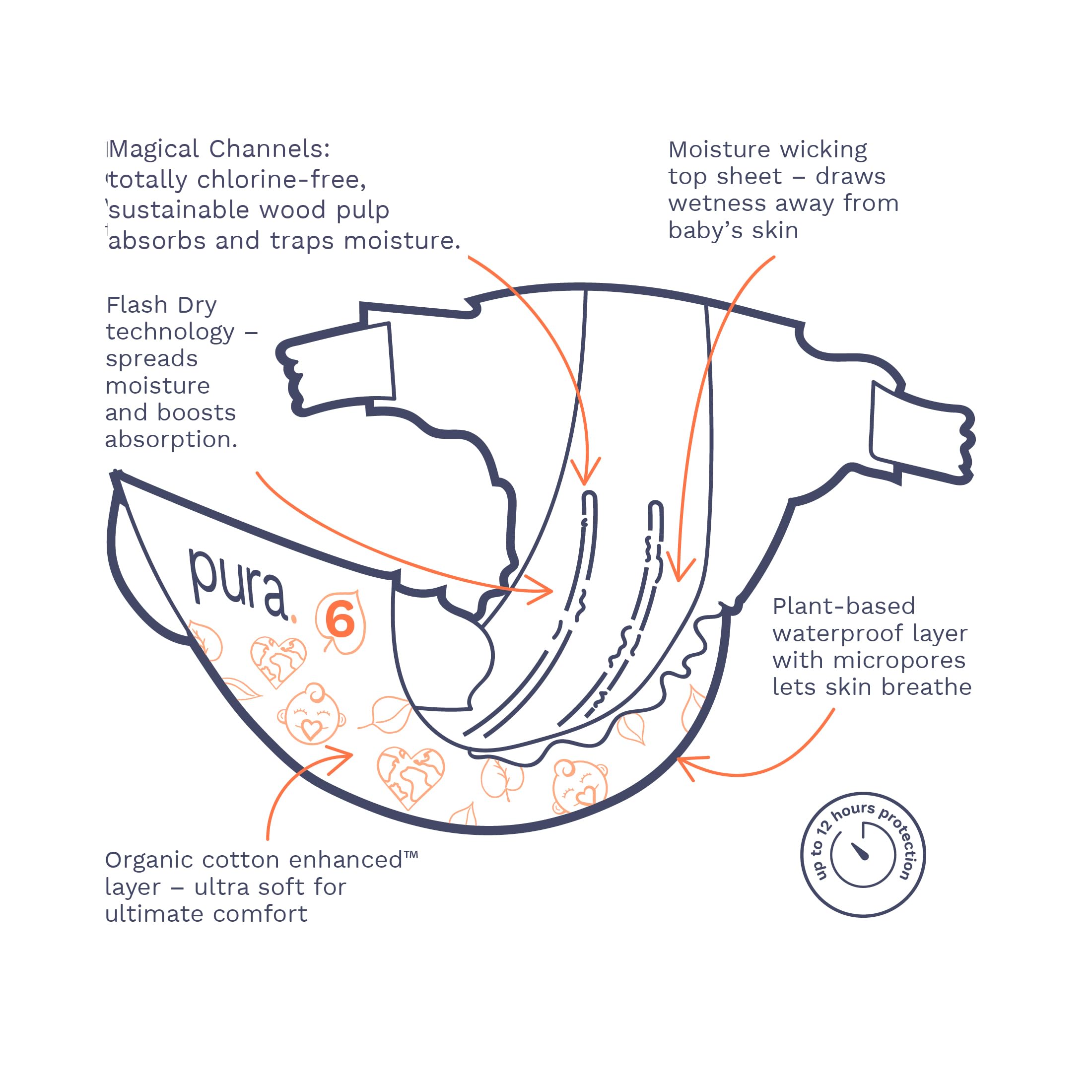 - SUSTAINABLY MADE: Pura’s nappies are manufactured in a carbon neutral plant, powered by green electricity. Where possible we’ve replaced oil-based plastics with plant-based materials such as wood pulp from sustainably managed forests.