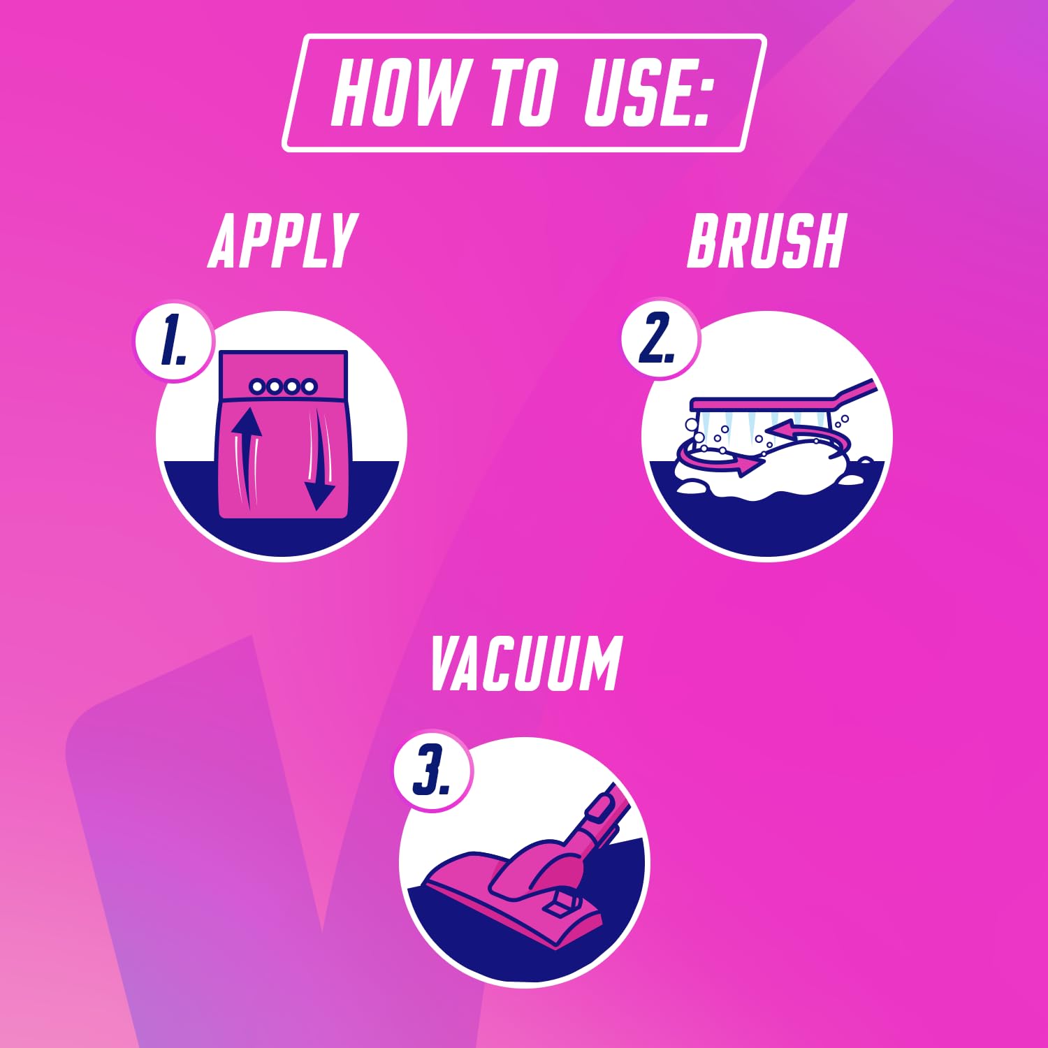 Shake well before opening Shake – Open – Sprinkle – Brush – Vacuum – Reseal Easy to use 1. Preparation: Vacuum clean the carpet before use. 2. Before use, shake the bag thoroughly to maximise product coverage. Turn the bag around and pull to completely remove both sealing strips from the bottom. 3. Hold the bag by the handle and shake to distribute the powder. No dampening with water is required. 4. Work in the Vanish Clean & Fresh Powerpowder with a brush. 5. Allow the Vanish Clean & Fresh Powerpowder to work until the carpet is completely dry (approx. 20 minutes). Keep the room ventilated during drying and vacuuming. It is still possible to walk on the carpet. 6. Completely vacuum up the dried powder. Change your vacuum cleaner bag regularly. 7. After use, carefully roll up the pouch towards the adhesive tag, gently lift the tag and pull it over to reseal. 8. In rare cases there may be light patches after vacuuming. In these cases, stain residues bind powder to them. We recommend removing the remains with a soft brush and then vacuuming. Avoid using water in any case. Usage Advice Test a hidden section of the carpet for colour fastness. In case of spillages or half solid substances (e.g. butter, ketchup) remove excess stains and pre-treat with Vanish Oxi-Action Carpet Stain Remover. Check vacuum cleaner is in working condition, according to manufacturer’s instructions. Ensure the bag is well fixed and not full; change bag regularly. Check presence and status of filters. If using a bagless vacuum cleaner, empty the tank and clean the filter before vacuuming the powder. Empty the vacuum cleaner tank regularly. For central Vacuum Cleaners refer to manufacturer’s indications. Re-close pack of best preservation of left product. Do not use with: Water Filter type vacuum cleaners, Water Extraction or Shampooer Machines, any other machine treatment involving water.